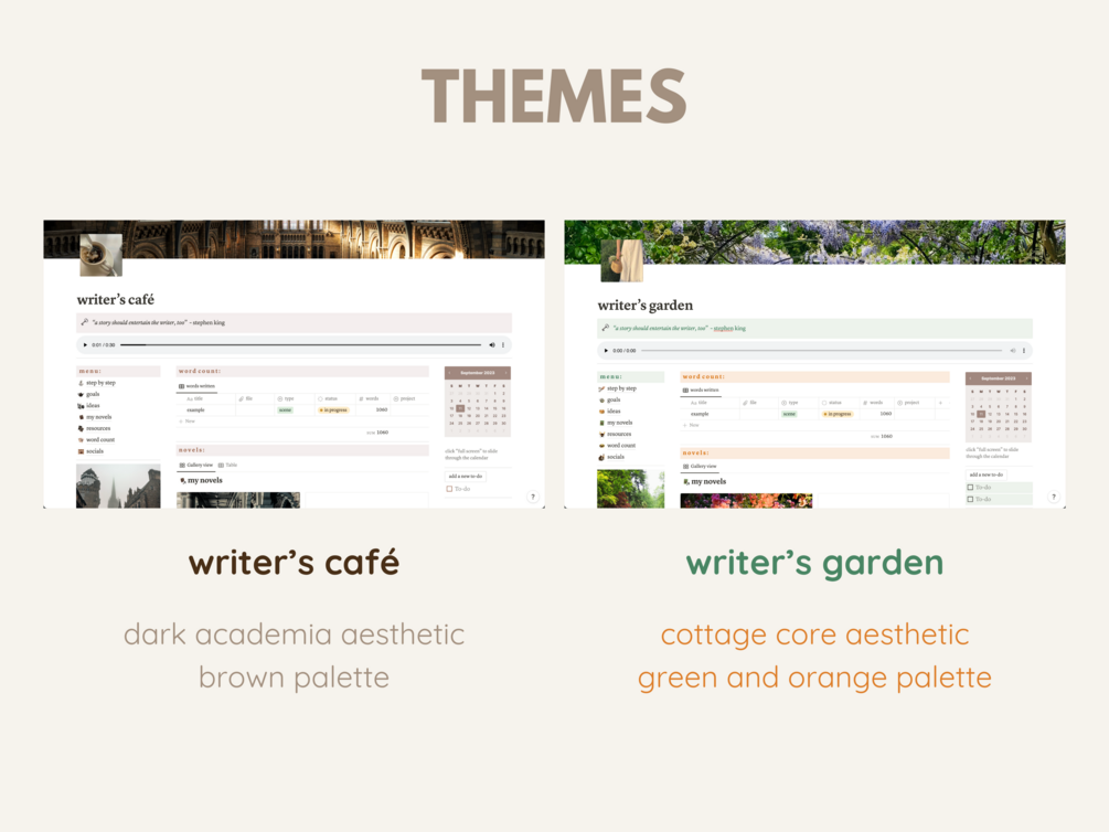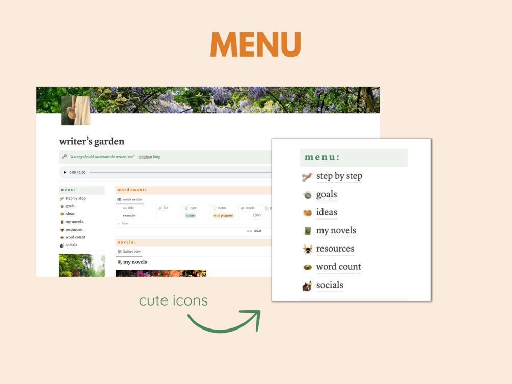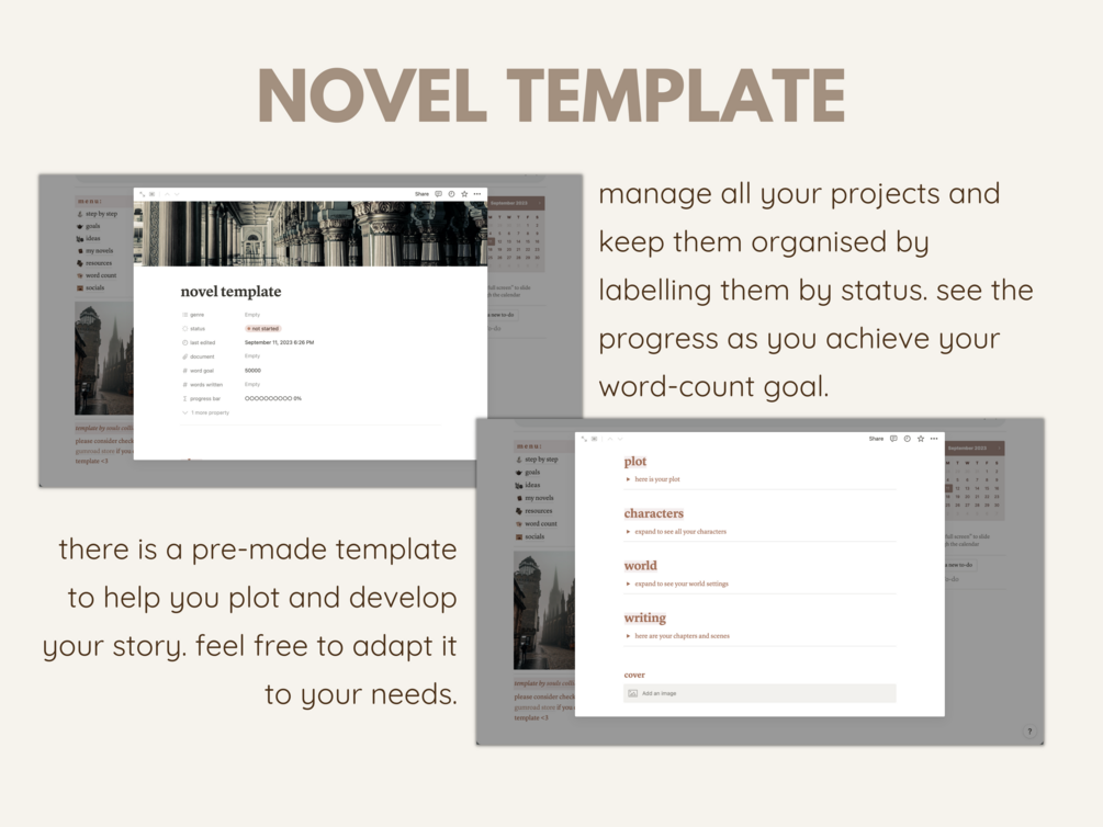 This template will be your best friend to help you organize your ideas, plot and write your books, and even track your word count and set goals. It is divided into seven main pages that can be found on the main menu, in the dashboard. Through this convenient menu, you have access to the following tools: