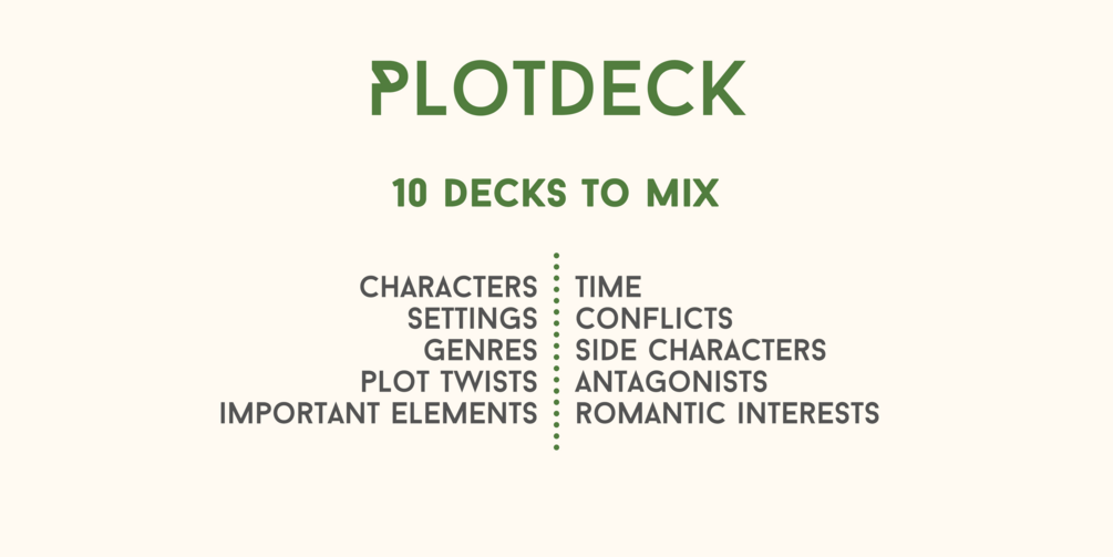 Itβs time to craft unique tales by drawing characters, settings, genres, plot twists, important elements, time, and conflict cards. Whether you're a writer or an aspiring author, PlotDeck is the perfect game to get rid of any block. You can call your friends over or enjoy solo play, and let these cards inspire your creativity.